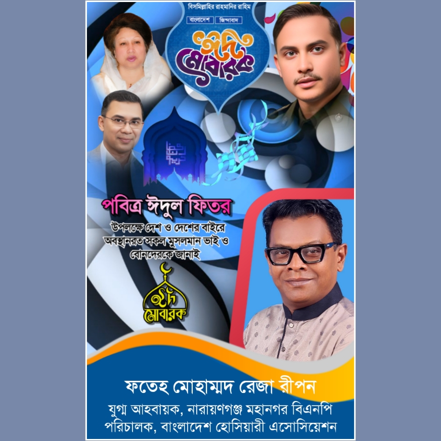 প্রেসবাংলা ২৪. কম: পবিত্র ঈদুল ফিতর উপলক্ষে দেশ ও বিশ্বের সকলকে আন্তরিক শুভেচ্ছা এবং ঈদ মোবারক জানিয়েছেন নারায়ণগঞ্জ মহানগর বিএনপির যুগ্ম আহ্বায়ক ও বাংলাদেশ হোসিয়ারী এসোসিয়েশনের পরিচালক ফতেহ মোহাম্মদ রেজা … Read More